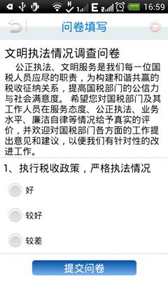 通過該模塊,稅務(wù)機(jī)關(guān)可以發(fā)放相關(guān)的調(diào)查信息,對(duì)為納稅人的服務(wù)情況進(jìn)行問卷調(diào)查,實(shí)現(xiàn)納稅人網(wǎng)上評(píng)價(jià)通過后臺(tái)集中抽取數(shù)據(jù),分析納稅服務(wù)質(zhì)效,為改進(jìn)服務(wù)質(zhì)量提供第一手資料。